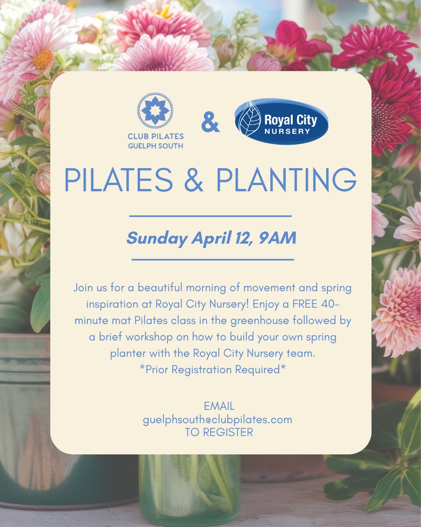 Join us on April 12 at 9:00 AM for Pilates & Planting at Royal City Nursery! Start your morning with a 40-minute mat Pilates class, followed by a spring planter workshop with the Royal City Nursery team